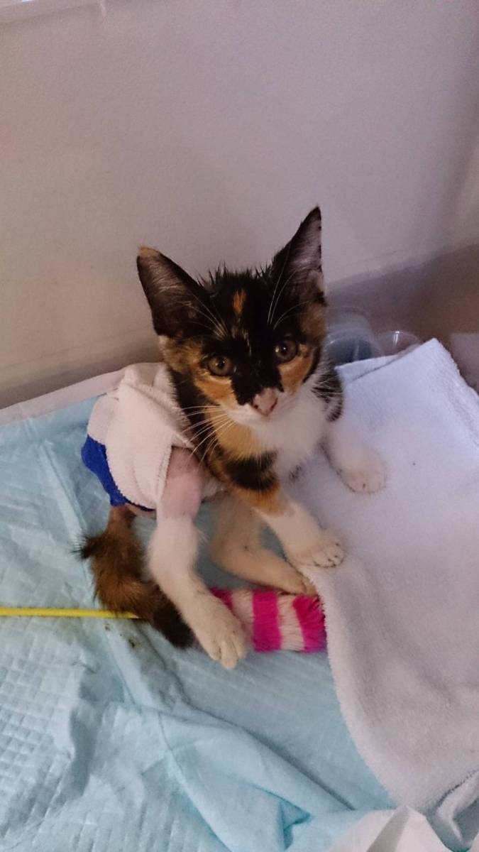 手術をしても後ろ足には障害が残る可能性が高いと、獣医師からは説明を受けた。 しかし、手術しなければ子猫の命は風前の灯火だ。後遺障害や手術・入院中のあらゆるリスクについて同意して手術に踏み切った。 粉砕骨折した腰骨の手術を終えて退院してきた直後が、左下の写真である。