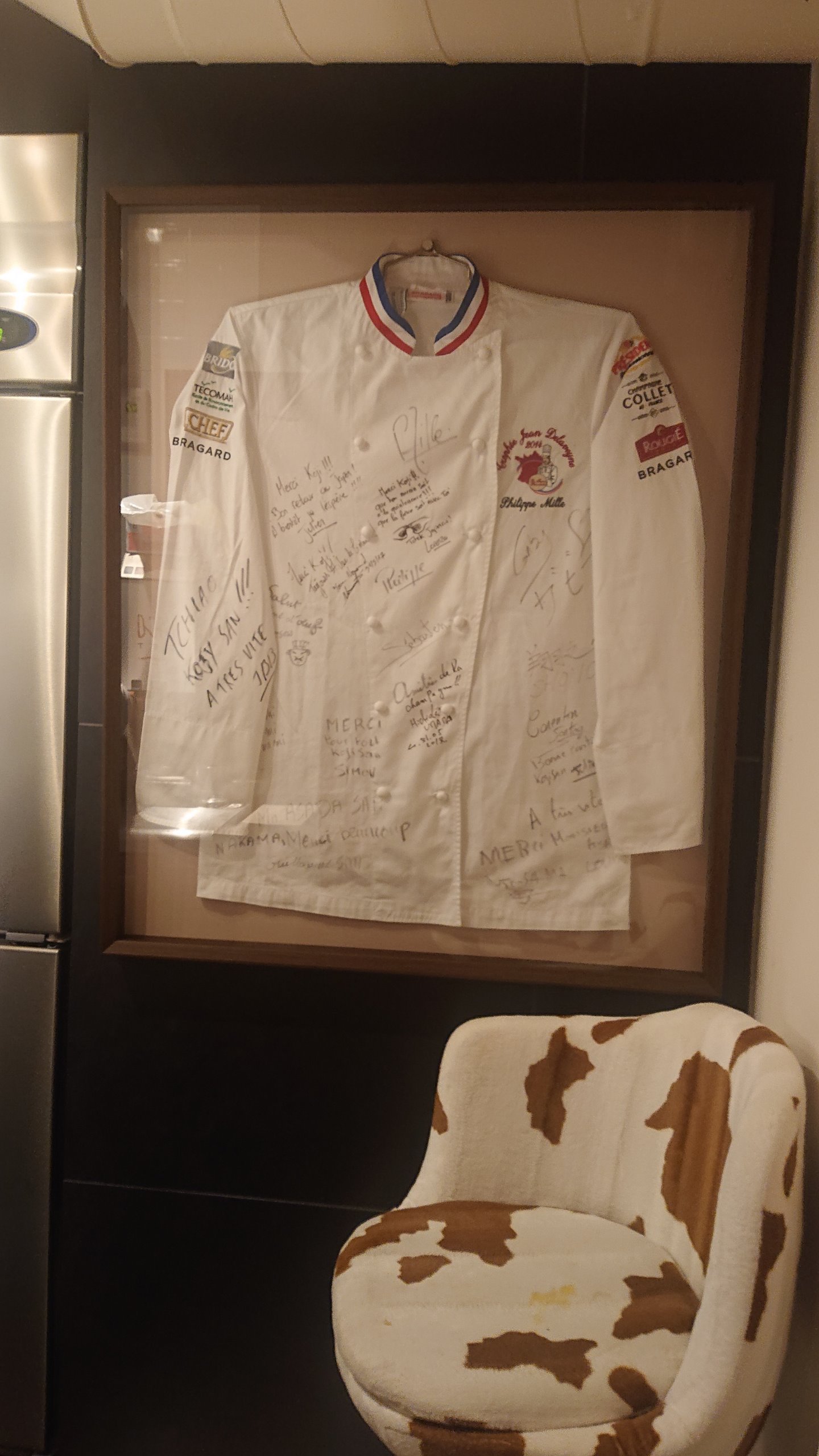 シェフの浅田浩司さんは、今でも毎年のようにフランスに通う研究心旺盛な人(右写真の中央が浅田シェフ)だが、そのシエフの宝物が右上の写真のコックコートである。フランスで修行を重ねた店を去り、帰国する際に、料理長を始めその店のスタッフが寄せ書きを書いてプレゼントしてくれた思い出の品とのこと。このコックコートを見るたびに、若き日の修行の日々を思い出し、気持ちも新たに料理に取り組んでいるのだろう。料理に対していつまでも真摯で誠実な姿勢が、提供される一品一品に表れている。