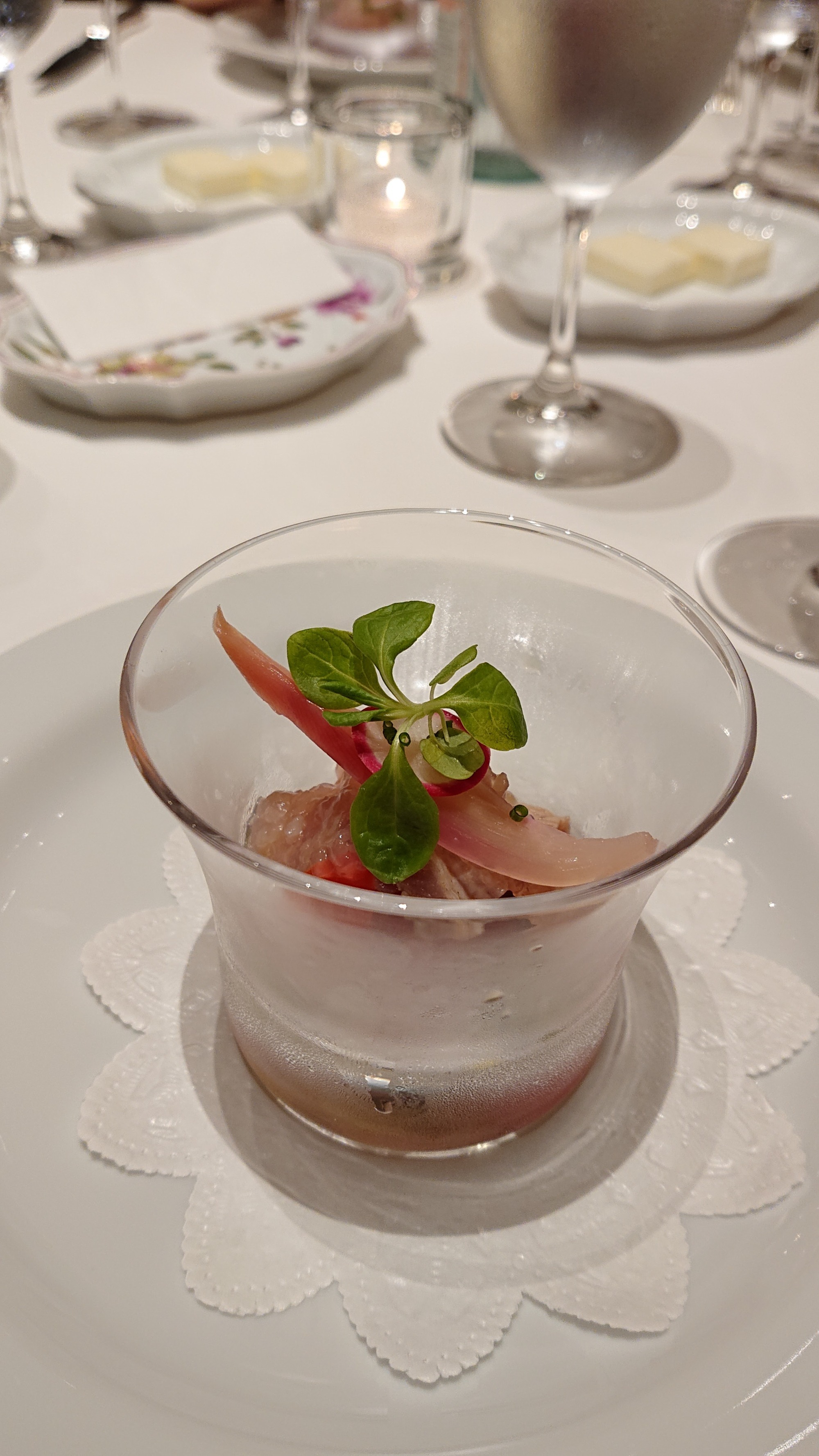 小沢貴彦エグゼクティブシェフ自らが出迎えてくれて、温かいもてなしを受けた。既知のソムリエ小浦健太さんの顔もあり、懐かしさ全開だ。小浦ソムリエにチョイスして貰ったシャンパーニュと濃い目のブルゴーニュの白、とても旨い。赤はボルドーではなくブルゴーニュでお願いした。ワインはこの3年近くセラーに寝かされたままで、ポテンシャルのあるワインは熟成が進み、近年のワイン価格高騰もあってかなりお得感のあるワインも多いとのこと。その一方で、寝かし過ぎて味の落ちたワインはバーゲンセールで早めに出し切ってしまわないといけないとのことで、色々と苦労もありそう。苦労と言えば、休業中に小浦ソムリエもホテルのフロント業務などソムリエ以外の業務もこなし、沖縄にも半年行っていたとのことで、生活も仕事も大変だったとの話しを聞いた。 調理部門も休業中に3人が離職してしまったとのこと。コロナが仕事も生活も変えてしまったんだなと、改めて実感する。久重浩シェフも去ってしまった1人だ。今は大竹の「SIMOSE French Restaurant」のシェフをしている。新しく就任したのは海野光生シェフだ。懐かしい顔、新しい顔、色々あっても「OZAWA」の料理は変わらない。
