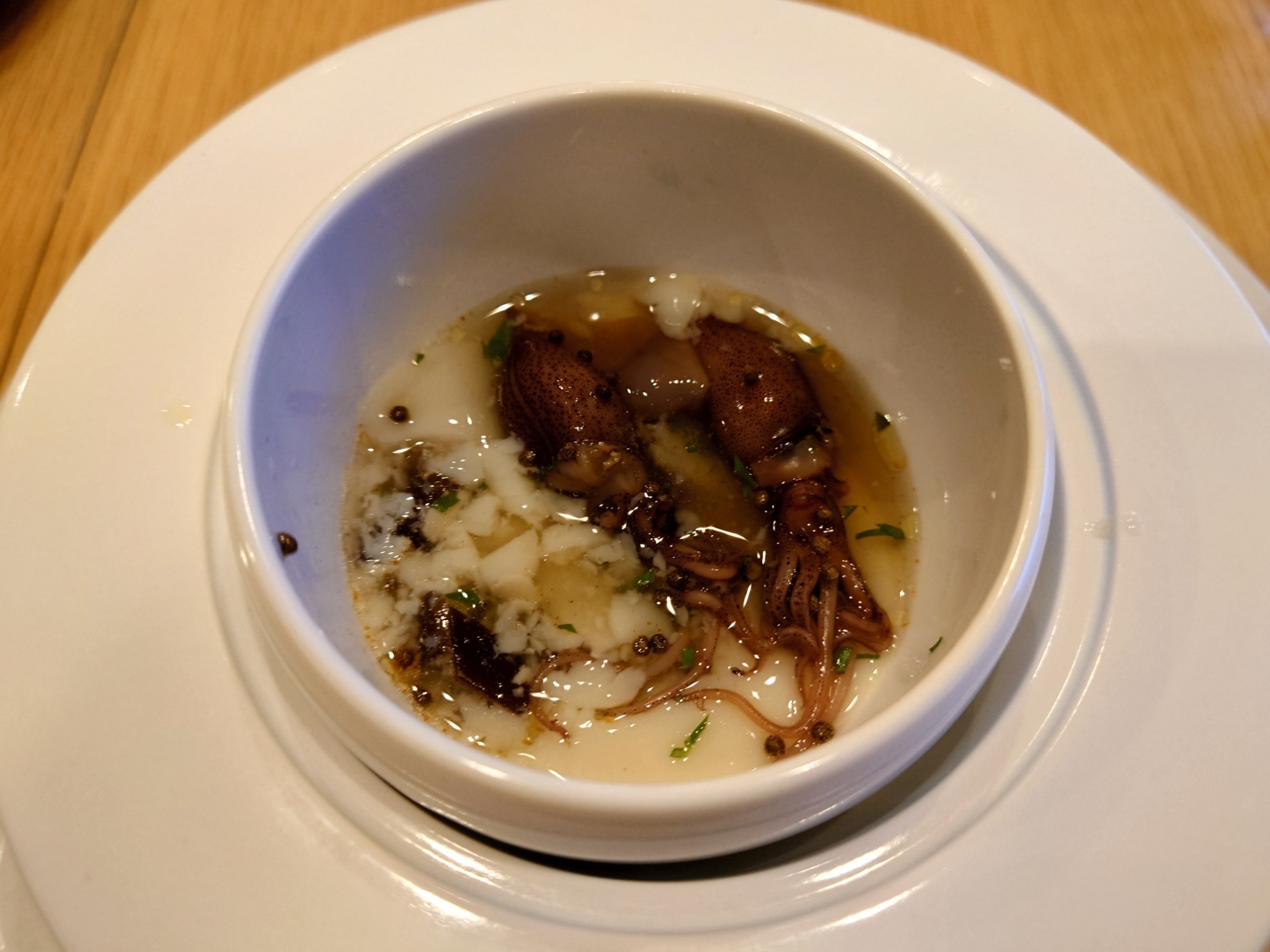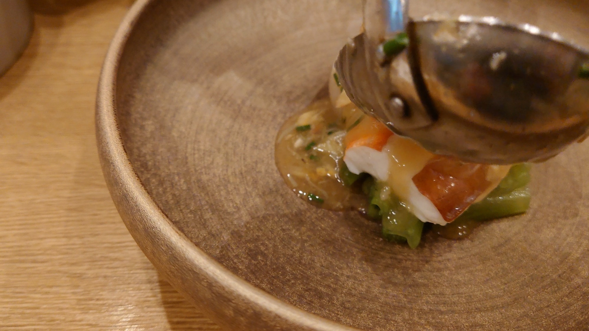 最初の「お口はじめ」はワタリガニを使っていて、蟹のエキスがしみ込んだスープが美味しい。 次の「鰆」はキャビアとハーブがよいアクセントになっている。 「イクラ」を使った洋風茶わん蒸し。 「鱧のベニエ」にはウニが載せられ、岩手産の松茸が添えられている。ベニエとウニの食感が面白い。 「鱸」はモリで突いて獲られたものだとのこと。 3時間かけて柔らかく仕上げた比婆牛と、添えられた野菜が美味しい。 締めは松茸御飯で、松茸の香ばしさと共に美味しく完食した。 デセールは、シナノパールといつもの小宇宙プリン。 飲み物はシャンパーニュで始まり白2種類の後、またシャンパーニュ。それからナパとブルゴーニュの赤を1杯ずつで、こちらも堪能した。