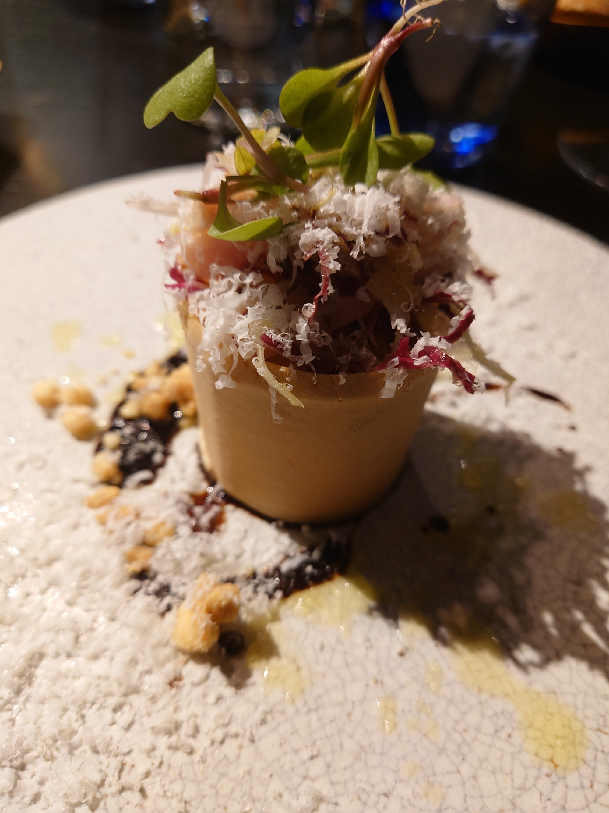特に絶品だったのは最初のオードブル2品。複雑で奥行きのある旨さを味わえた。牡蠣は軽く火を入れただけの半生状態で、これも食感がよく美味しかった。河豚の雑炊も相変わらず旨い。メインは和牛と骨付き鴨肉と2皿供された。最後のデセール。最近は2~3皿と多種提供される傾向にあるが、1品だけ。これがまた旨かった!専門のパティシエが作ったかのような美味しさ。最後を締めくくるに相応しいデセールだった。