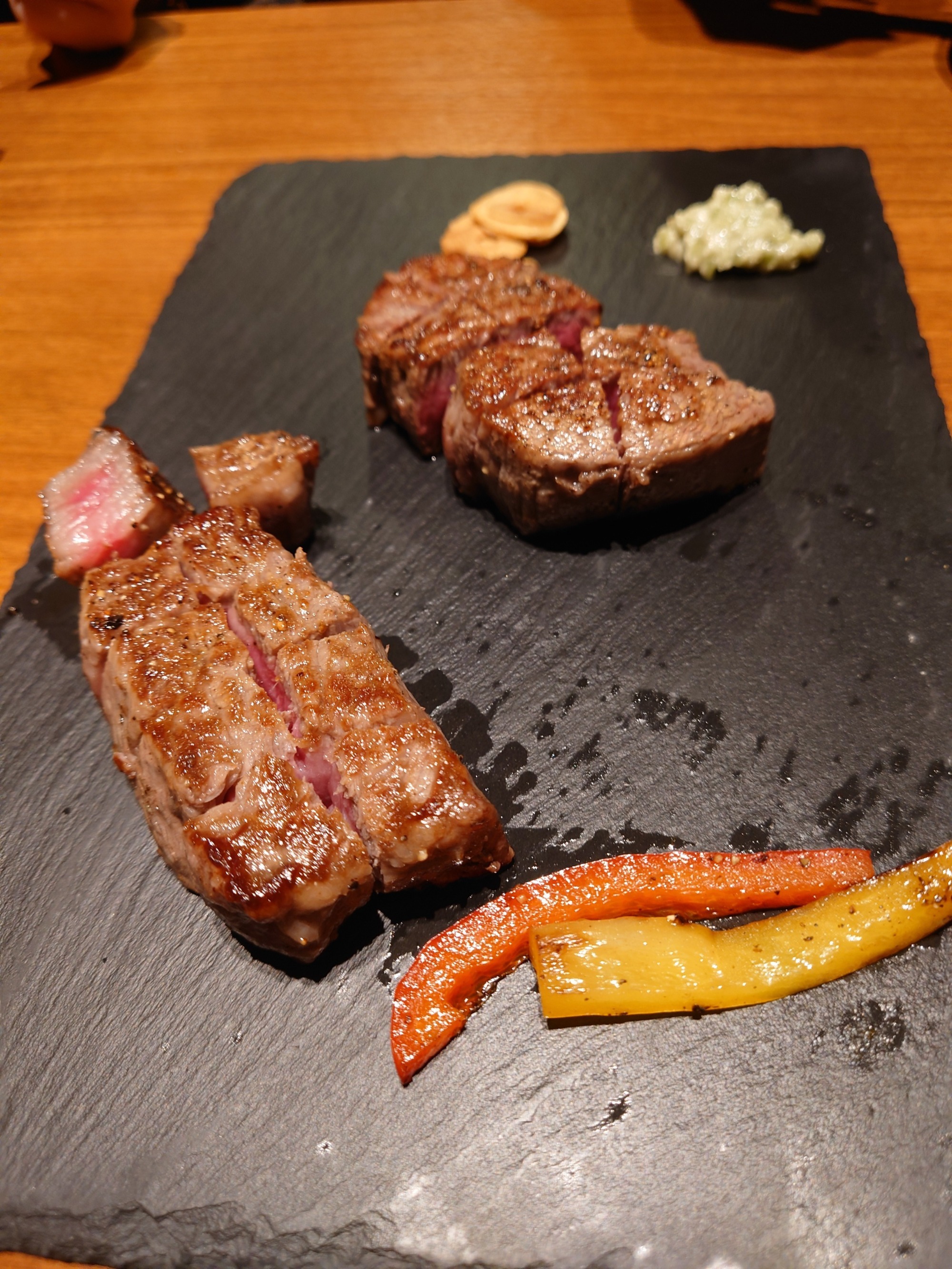 翌27日は当初、銀座うかい亭に行く予定にしていたのだがスケジュールが変更になり、予約していたうかい亭の時間変更が叶わなかったため、急遽、同じ銀座の鉄板焼「かいか」に変更した。フォアグラや伊勢海老、鮑など鉄板焼きではおなじみの食材に、和牛のフィレとサーロインを食べ比べるコースだ。一番美味しかったのは伊勢海老の味噌汁かな。肉も鮑も確かに美味しいのだが、特別感は感じられなかった。スタッフのサービスはさすがでスマートな立ち居振る舞いには、うーん、さすが銀座の特別感、魔王のロックで気持ちよく酔わせてもらった。