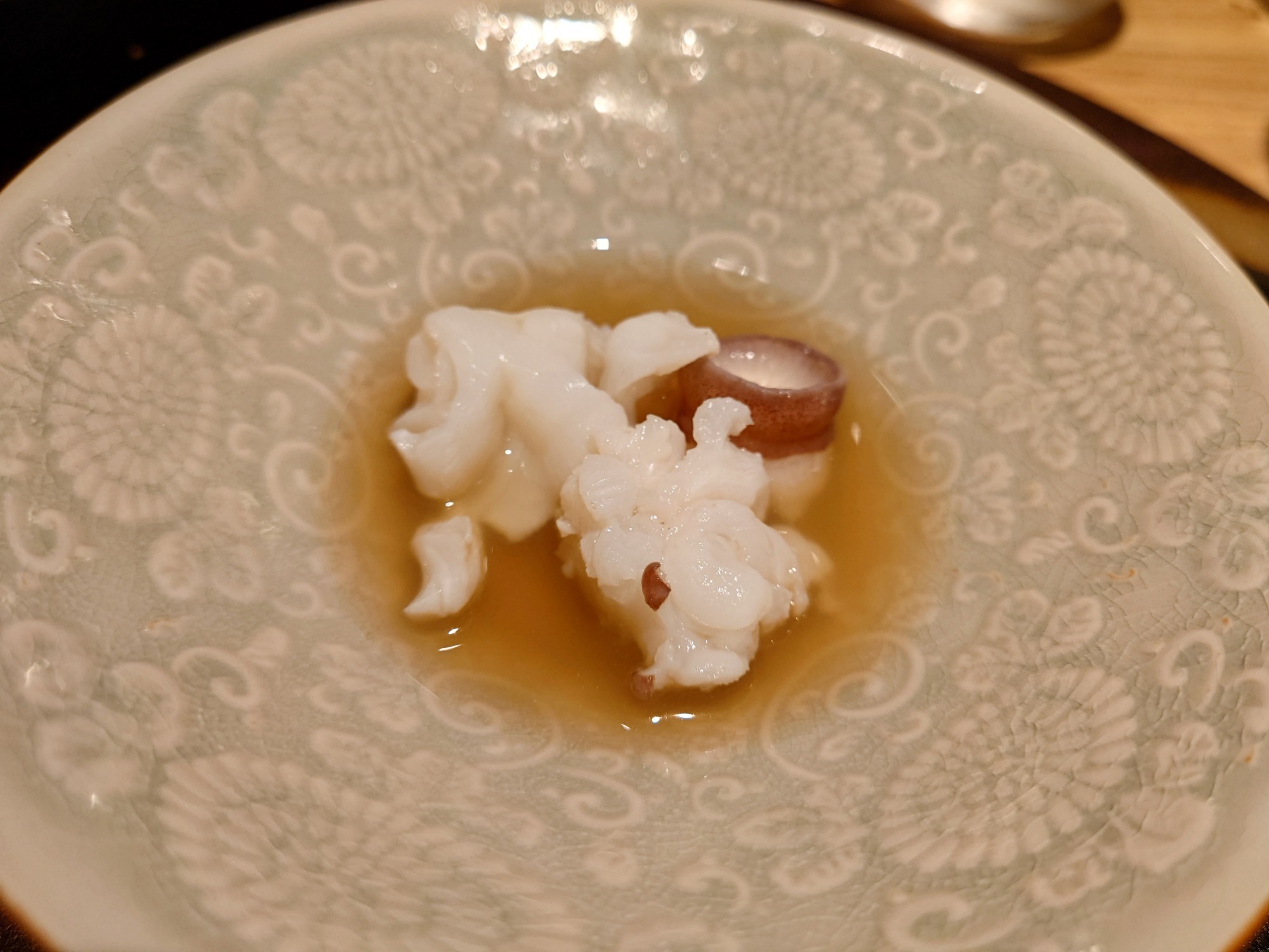 店内はカウンター席のほかボックス席、個室とあり、カウンター内の料理人や和服姿の仲居の接客も慇懃で、店構えの高級感もあって、接待などにも用途がありそうだ。 料理も「接待用」に相応しい見た目と食材を用い、飲み物もシャンパーニュを始めボルドーやブルゴーニュのワイン、日本酒、ウイスキーとラインナップをしっかりと揃えている。 今日は、山崎のオンザロックを頂くことにした。